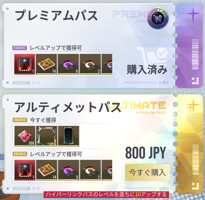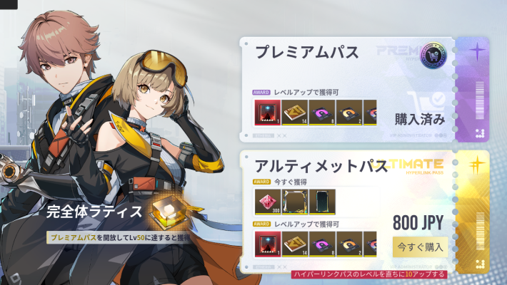 |  ▼ハイパーリンクパス | 【おすすめ度】 プレミアム:★★★★★ アルティメット:★★★☆☆ 任務を達成してクリスタルやガチャチケット、強化素材を獲得 【値段】 プレミアム:1760円 アルティメット:2500円 |