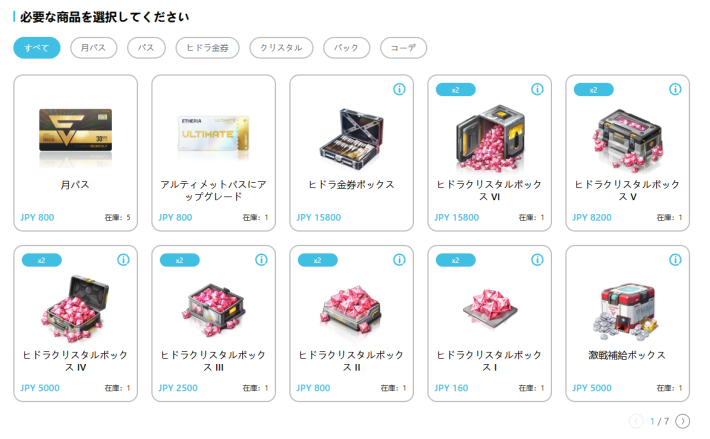 |  ▼クリスタル補給I | 【おすすめ度】★★★☆☆ 【購入回数】毎週1回 【主な内容物】 異格プロトタイプ× 10 【値段】800ヒドラクリスタル |