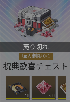 |  ▼祝典歓喜チェスト | 【おすすめ度】★★★★☆ 【購入回数】1回 【主な内容物】 極相原型×10 ヒドラクリスタル×500 【値段】2500円 【販売期限】10/23 4:59まで |