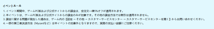 チャージセンターは全課金アイテムを5%オフで購入できる公式ストアです。PC版の場合はゲーム内からの課金時にチャージセンターが開くため、この割引は自動で適用されます。