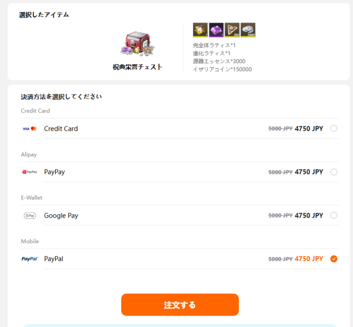 ログインが完了したら課金アイテム一覧から購入したいアイテムを選びましょう。アイテムを選び、画面下部から決済を完了することで購入完了です。