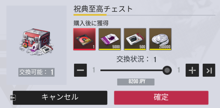 |  ▼祝典至高チェスト | 【おすすめ度】★★☆☆☆ 【購入回数】1回 【主な内容物】 SSR確定ガチャチケ SSR原相異格者1凸分の原質pt 【値段】8200円 【販売期限】10/23 4:59まで |