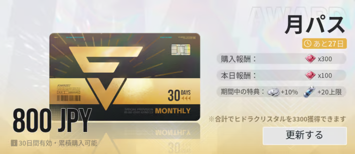 課金を検討する場合はまずは月パスを購入することをおすすめします。月パスは購入してから毎日ヒドラクリスタルを獲得できるようになるアイテムで、800円でクリスタル3300個分と非常にお得になっています。