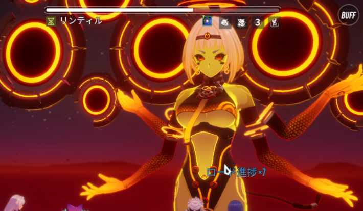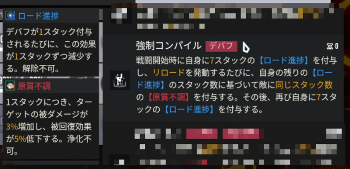 ラスボスリンティルは戦闘開始時に【ロード進捗】を7スタック獲得します。この状態で「リロード」を発動されると味方全体に同数の【原質不調】が付与されます。デバフを1つ付与すると【ロード進捗】を1つ解除できます。