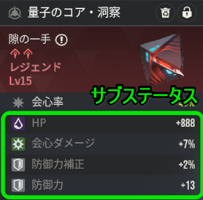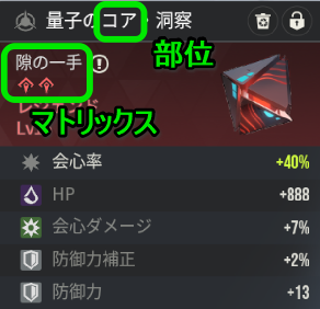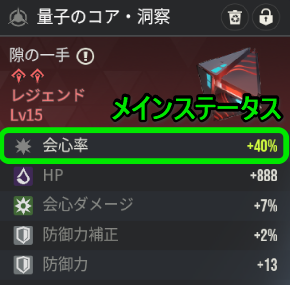 部位とマトリックスが求めているものである場合は続いてメインステータスを確認し、求めているものでなければ周回を続行します。メインステータスはコアのみ厳選が必要です。