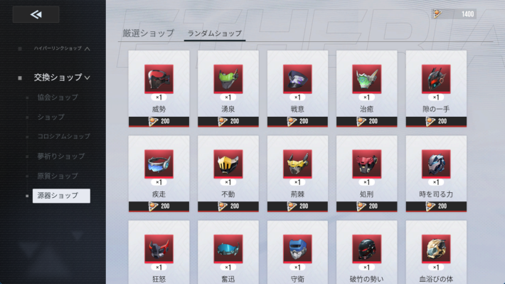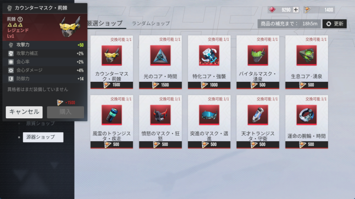 ゲームを進行することで源器ショップに厳選ショップが追加されます。厳選ショップは指定された性能の源器をそれぞれ1つだけ交換できるショップです。
