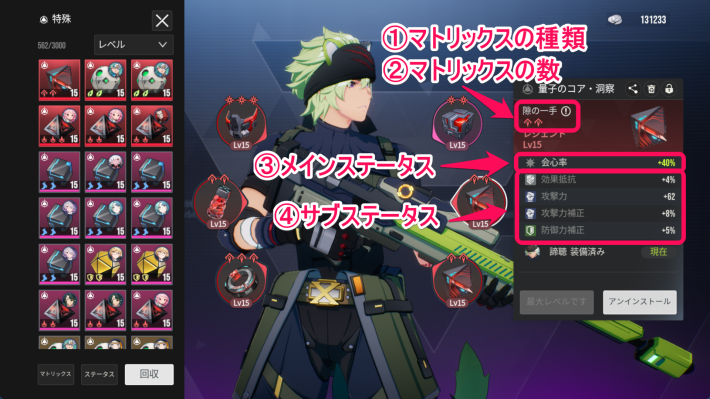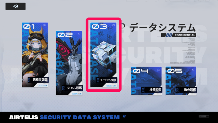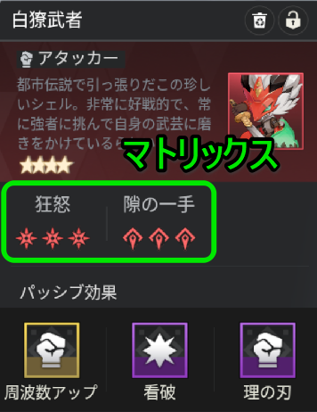 ①マトリックス の種類 | ・同じマトリックスを集めることでセット効果が発動 ・シェル毎に付与される候補が決まっている |