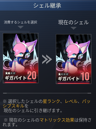 シェルは「継承」で強化状態を他のシェルに引き継げます。後から目当てのマトリックスを持つシェルが手に入った場合でも継承で強化状態を引き継げるため、シェルの厳選は後回しでも問題ありません。