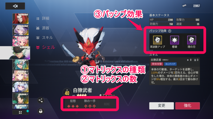 目当てのシェルが手に入ったら次はシェルを強化します。シェルのレベルを上げて突破をする毎にパッシブ効果枠が解放されるので、まずは3回突破をしてパッシブ効果を3つ解放しましょう。