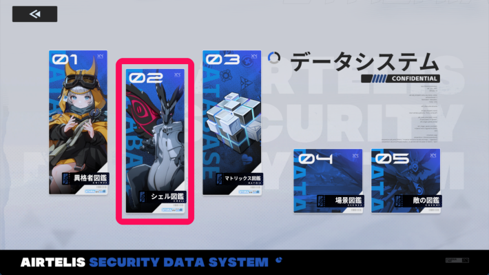 まずはシェルを決めましょう。メニューの図鑑>シェル図鑑から詳細なシェル情報を確認できるので参考にしてください。