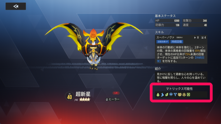 厳選するシェルが決まったら次はマトリックスを決めましょう。シェル図鑑のシェル詳細右下の「マトリックス可能性」をタップすることで付与されるマトリックスの候補を確認できます。