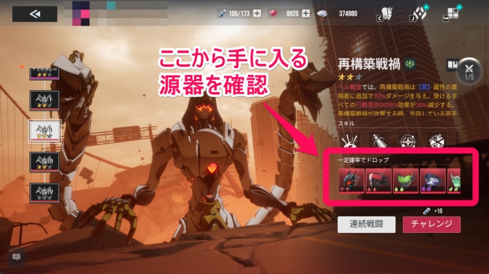 欲しいマトリックスが決まったら、そのマトリックスを持つ源器が手に入るリミナルスペースを周回して源器を集めましょう。難易度毎に入手できるレアリティとマトリックスの数が決まっています。