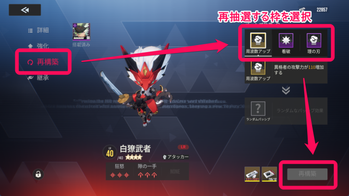 突破時にランダムで付与されたパッシブ効果は、強化メニューの「再構築」から再抽選することができます。再構築には強化時にも使用する訓練データの他に、専用素材の再構築チップを消費します。