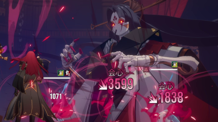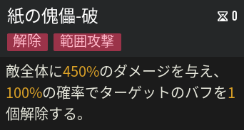【狂言】 味方へのデバフ | 【効果】 ・ターン開始時にダメージを受ける 【付与タイミング】 ・スキル「カラクリ万葉」使用時に付与 |