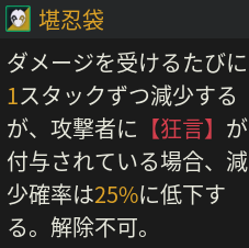 【堪忍袋】 オーロラのバフ | 【効果】 ・【怒り】に変化する前のまだ効果のないバフ ・攻撃1ヒット毎に1スタック減少 ・【狂言】所持者は攻撃時にスタックを減少させる確率が25%に低下 【付与タイミング】 ・戦闘開始時に15スタック付与 ・【堪忍袋】が残っている時にスキル「カラクリ万葉」を使用すると15スタック再付与 |