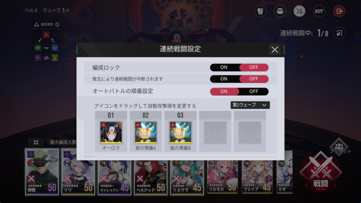 連続戦闘での周回時には「オートバトルの順番設定」をONにして、オーロラを最優先に設定しましょう。