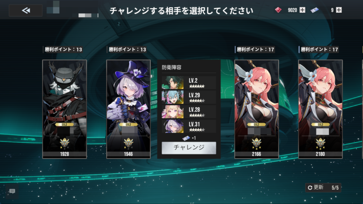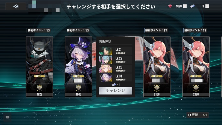 ランダムで5人のプレイヤーが選ばれ表示されるので、好きなプレイヤーを選び「チャレンジ」をタップで対戦開始です。対戦前に相手の編成を確認できるため、どの相手を選ぶかの参考にしましょう。