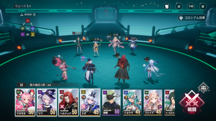 対戦相手が決まったら編成を組み戦闘を開始しましょう。編成人数は4人で特殊な編成条件等もないので、編成の組み方はPvEと特に変わりません。