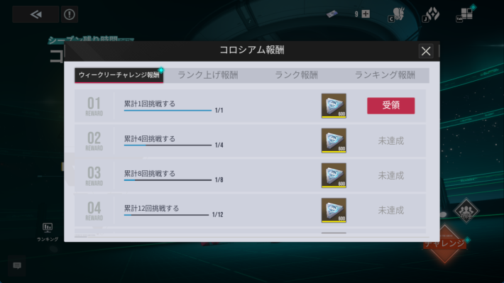 報酬の確認や獲得ができるメニューです。ランク報酬の他に、コロシアムに挑戦するだけで獲得できるウィークリー報酬も存在します。