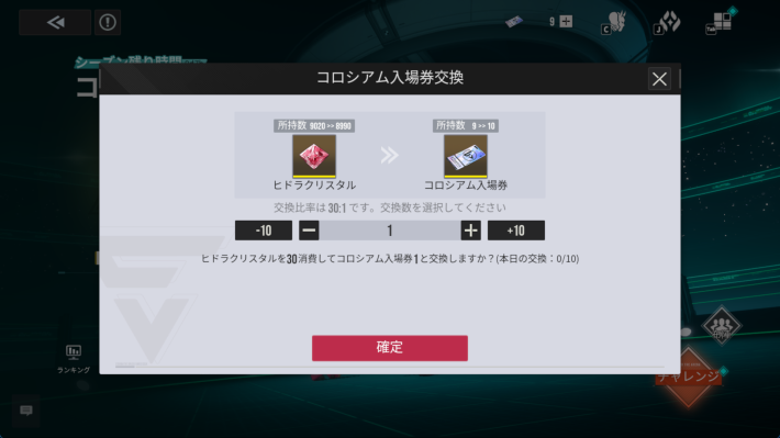 毎日10回までヒドラクリスタルを使用してコロシアム入場券を購入できます。クリスタル30個で入場券1枚を購入可能です。