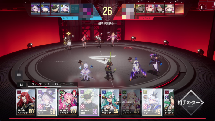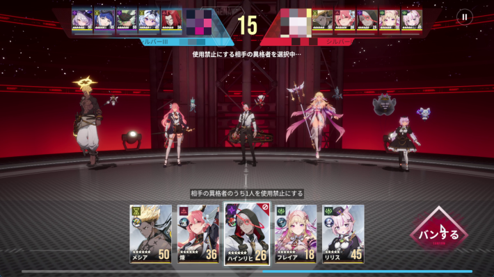 5人ずつキャラを選択したら、お互い相手のキャラを1人選んでBAN(編成から除外)します。BANが終わり残った4人が最終的な編成です。