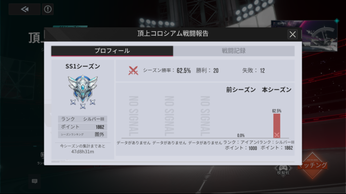 過去4シーズンまでの勝率と各戦闘個別の記録を確認できます。「戦闘記録」からは対戦相手の詳細データだけでなく戦闘のリプレイを再生することもできるため、戦略の研究に役立つ機能です。