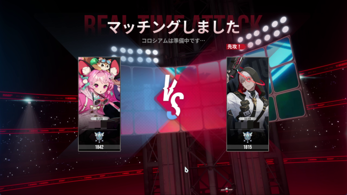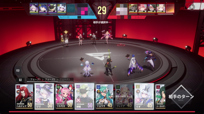 頂上コロシアムではお互い順番に1~2人ずつキャラを選び編成を組んでいきます。ランダムで先攻/後攻が決まり、先攻プレイヤーからキャラを編成するというシステムです。