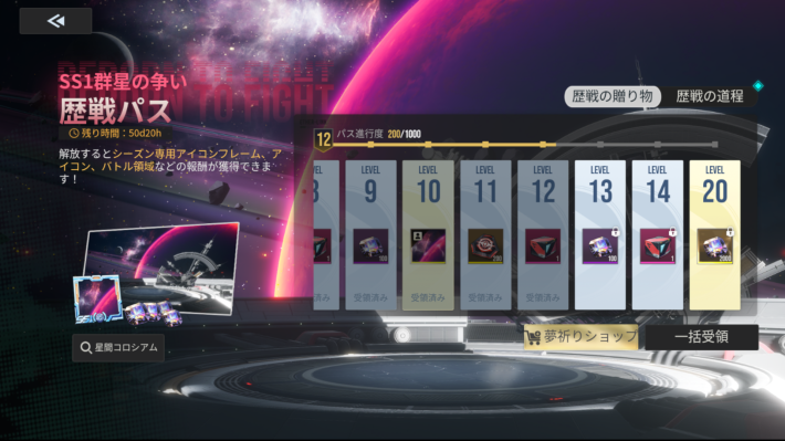 歴戦パスは頂上コロシアム専用のシーズンパスシステムです。任務を達成することで「歴戦ポイント」を獲得し、ポイントが1000に達する度にレベルが上昇。レベルに応じた報酬を獲得できます。