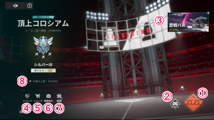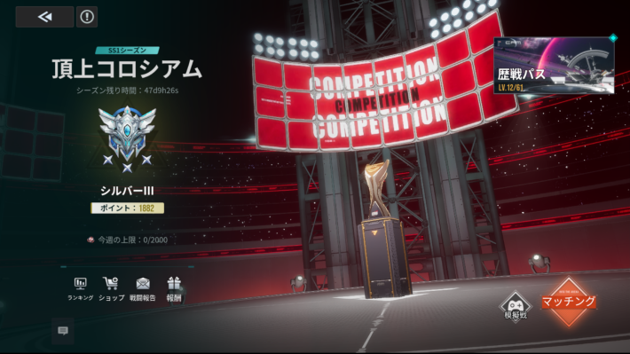 頂上コロシアムには歴戦パスというシーズンパスシステムが存在します。任務を達成することで「歴戦ポイント」を獲得し、ポイントが1000に達する度にレベルが上昇。レベルに応じた報酬を獲得できます。