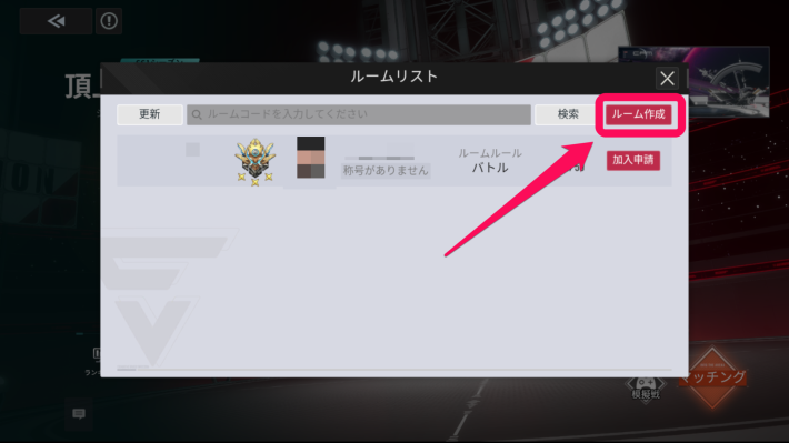 模擬戦を開催する場合は自身でルームを作成する必要があります。メニューの右上の「ルーム作成」をタップすることでルームの作成が可能です。