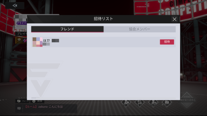 フレンドや協会メンバーを招待できるメニューです。現在オンラインのフレンドや協会メンバーが表示されるので、招待したいプレイヤーを選び「招待」をタップしてルームに招待しましょう。