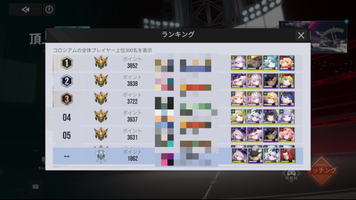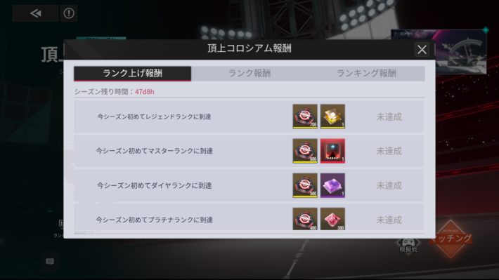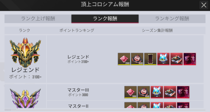 頂上コロシアムにはランク制度が存在し、勝利を重ねポイントを溜めることでランクが上昇。到達したランクに応じた週間報酬/シーズン報酬を獲得できます。