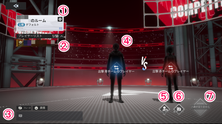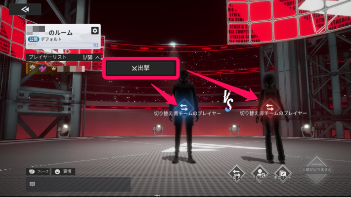 ルームに参加しているプレイヤーが表示されるリストです。プレイヤーを選択し「出撃」をタップし、空いている対戦者の枠をタップすることで対戦参加者として設定できます。