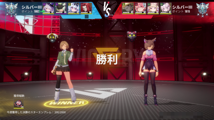 対戦が終了し勝利した場合はランクポイント上昇と決勝のスターエンブレム200獲得、敗北した場合はランクポイント減少と決勝のスターエンブレム50を獲得します。
