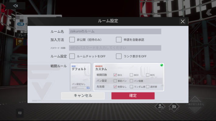 ルーム情報欄の歯車マークをタップするとルーム設定メニューが開きます。ルーム名やパスワード、ルームの公開設定の他、「戦闘ルール」をカスタムにすることで対戦ルールを変更することも可能です。