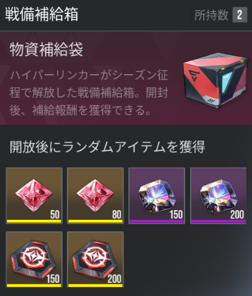 戦備補給箱は使用時に候補からランダムでアイテムを獲得できる物資補給袋の一種です。