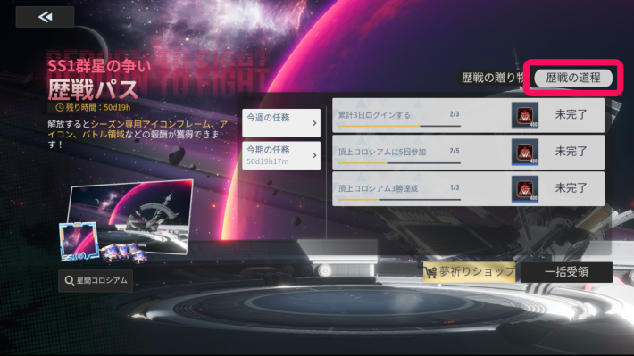 「歴戦の道程」タブから任務を確認できます。任務はウィークリーとシーズンの2種類に分かれており、頂上コロシアムに挑戦するだけで達成できるものも存在。任務も意識しながらプレイするのがおすすめです。