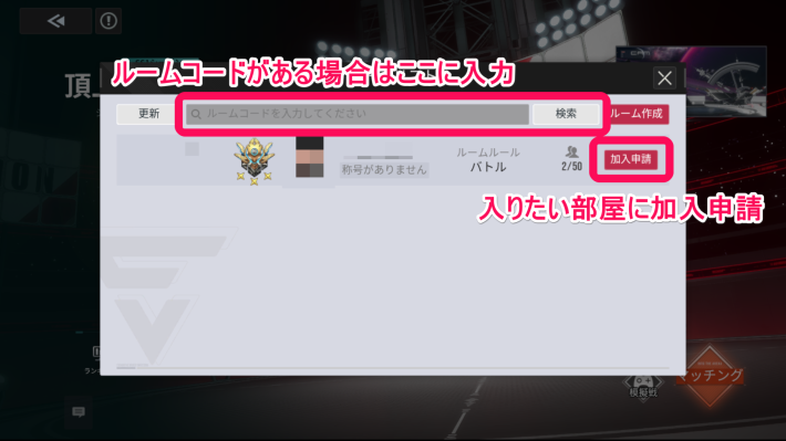 「模擬戦」をタップすることでフレンドや協会メンバーが開催している模擬戦ルームが表示されるので、「加入申請」をタップして参加できます。ルームコードを持っている場合は上部の窓に入力して検索しましょう。