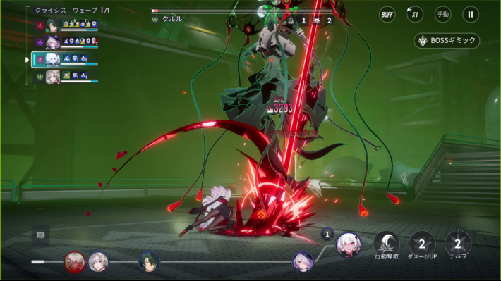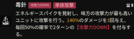 クルルは通常攻撃で攻撃力が一番高いキャラに単体攻撃を行い、【攻撃力DOWN】を付与します。デバフ解除や無効化で対策する他、アタッカー以外に攻撃力の高いキャラを編成して攻撃を引き付けることも可能です。
