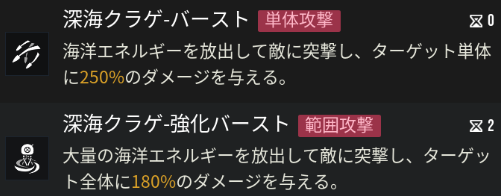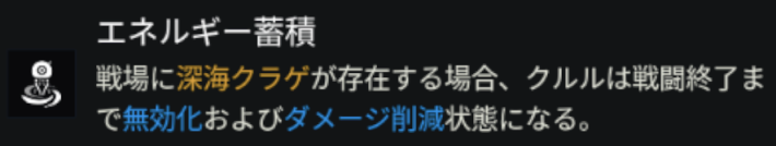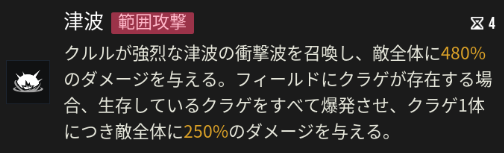 雑魚召喚から1ターン空けて強力な全体攻撃「津波」を行ってきます。津波は存在しているクラゲ1体に毎に追加ダメージを発生させる強力な攻撃です。津波後に雑魚は全て消滅します。