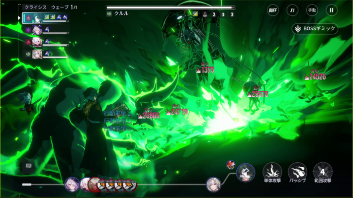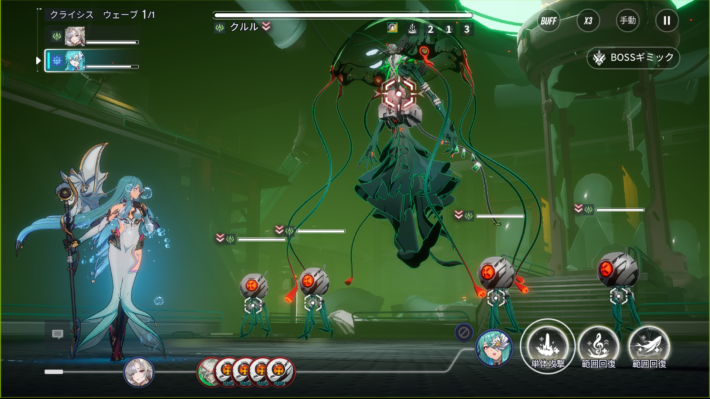 クルル戦は雑魚処理とクルルにダメージを与えることの繰り返しです。雑魚再召喚までに倒しきれない場合は、アタッカーの全体攻撃スキルを使わず取っておくといった判断も重要になります。