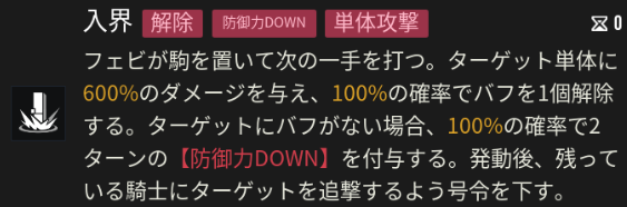 |  通常攻撃 | 単体攻撃 【効果】 100%の確率でバフ解除 【対象にバフがない場合】 100%の確率で防御DOWN付与 発動後に騎士が追撃 |