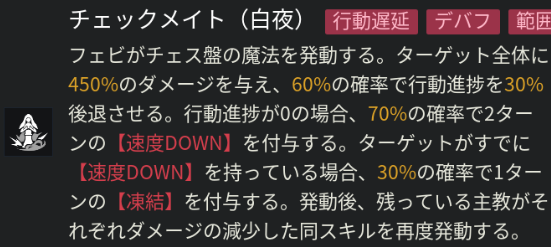 |  スキル2 | 全体攻撃 【CD】2ターン 【効果】 60%の確率で行動進捗60%後退 【対象の行動進捗が0の場合】 70%の確率で速度DOWN付与 【対象が既に速度DOWNを持つ場合】 30%の確率で凍結付与 発動後に教主がスキル2で追撃 |