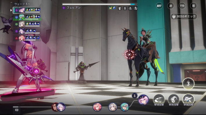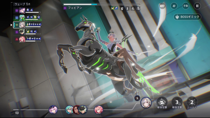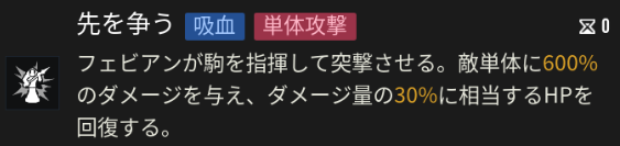 シールドの他に、フェビアンは通常攻撃時に与ダメージの30%分回復する効果も持ちます。フェビアンを倒すには、シールドを剥がしHP回復量を超える与ダメージ量が必要です。
