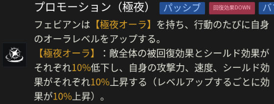 |  【極夜オーラ】 | 【味方へのデバフ効果】 被回復率/シールド効果が減少 【フェビアンのバフ効果】 攻撃力/速度/シールド効果が上昇 毎ターン全ての効果が10%上昇 |