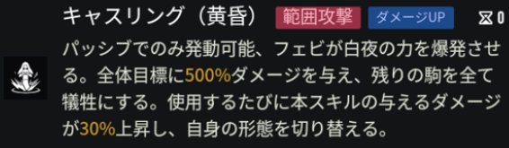キャスリングは使用する度にダメージが増加します。より長く戦い続けるために、CD明けで即形態変化させずにフェビ形態でダメージを稼ぐという戦略もありです。