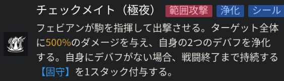 フェビアンはスキル2使用時に自身のデバフを2個解除し、【固守】を付与します。【固守】は永続で解除不可のシールドで、攻撃してシールド値を0にすることでしか解除できません。