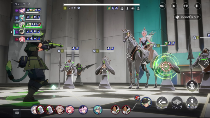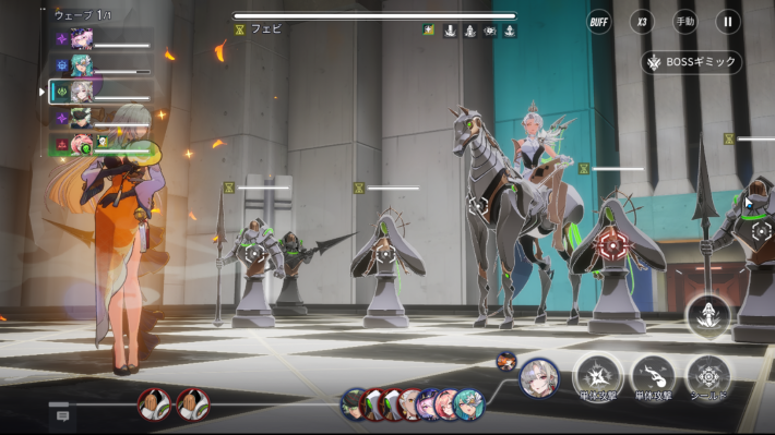 フェビの通常攻撃発動後、全ての騎士が対象に追撃。騎士は攻撃時にバフ解除やデバフ付与を行うため、対象になったキャラは大きく耐久力が低下します。