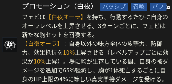 |  【白夜オーラ】 | 【メイン効果】 自身以外の味方の攻撃/防御/効果抵抗上昇 フェビの行動の度に上記のバフ量が+10% 【雑魚関連効果】 雑魚が残っていると被ダメージが65%減少 雑魚を倒すことでフェビのHPが減少 3ターン毎に毎に雑魚を再召喚 |