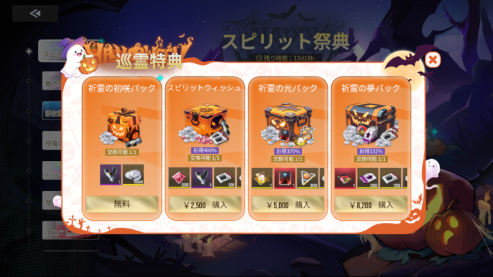 「巡霊特典」ではイベント限定の課金パックを購入できます。お得な育成素材パックがラインナップされているほか、無料のパックもあるため是非チェックしてみましょう。